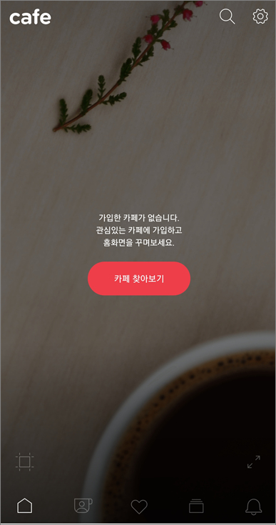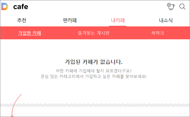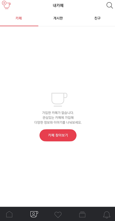 다음카페 앱을 접속해보면 아래와 같습니다. 가입되어있는 카페가 없으면 아래처럼 화면이 보일 것입니다.